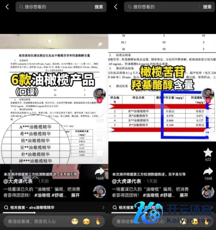 2月24日抖音测评博主大虎课代表发布了一则视频,题为《一场蓄谋已久的“油橄榄”骗局,把耗费者耍得团团转!》。该博主称其向第三方试验室送检了6款热点油橄榄精华产物(A***油橄榄精华、希**油橄榄精华、欧*油橄榄精华、安**油橄榄精华、朴*油橄榄精华、神***油橄榄精华),其中4款产物橄榄苦苷和羟基酪醇的含量齐不高,不仅如斯,更令东说念主颤抖的是好意思国品牌C某某的油橄榄精华未检出这两个身分。