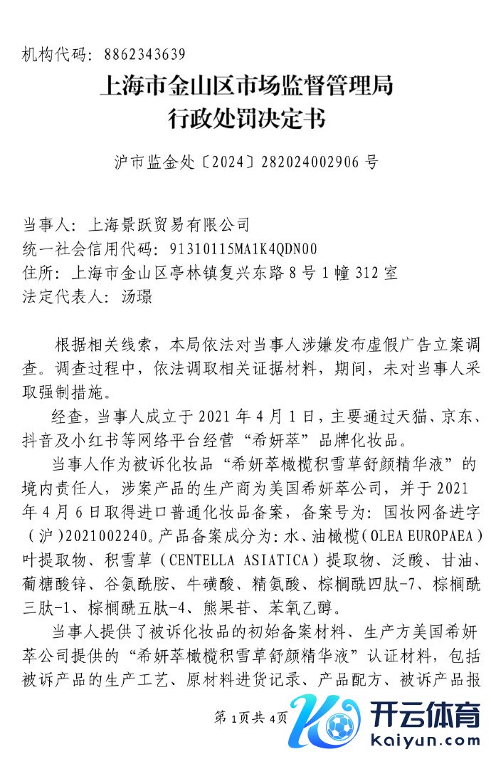 CSS希妍萃在中国大陆的主要运营公司——上海景跃买卖有限公司(以下简称“上海景跃”)因发布失实告白被上海市金山区市集监管局罚金50万元。