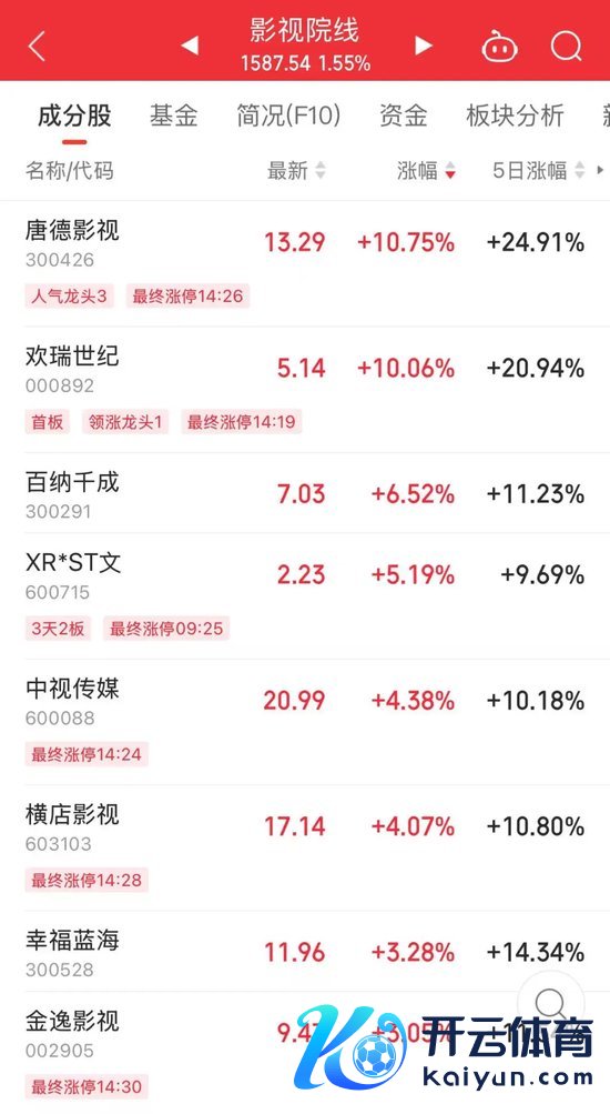 午后约14时14分傍边,A股影视板块蓦然大幅拉升。欢瑞世纪由涨幅不到3%,凯旋拉升至涨停板;唐德影视由跌近5%眨眼间翻红,盘中一度涉及“20cm”涨停;百纳千成股价由涨近1%,一度拉升至13%以上;中视传媒股价由平盘近邻一度拉升至涨停板;金逸影视盘中一度由绿盘拉升至涨停板。