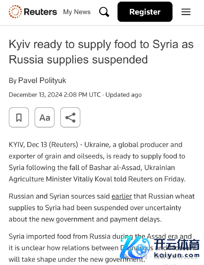 在大马士革易主后,俄罗斯政府不再向叙利亚供应食粮,俄罗斯政府提供给叙利亚的食粮主要来自被占领的乌克兰邦畿。当今,乌克兰政府准备接过这一重任,乌克兰总统泽连斯基已要求乌克兰政府与海外伙伴招引组织向叙利亚提供食粮: