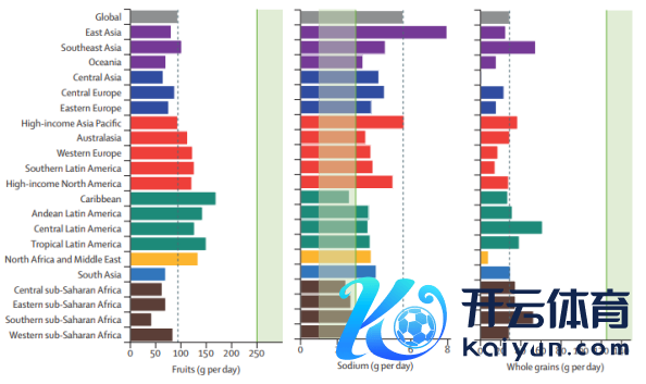 钠摄入量高、全谷物摄入量低以及生果摄入量低。其中,东亚地区因为将日韩单独计入了“高收入亚太地区”板块,是以基本上不错视为以中国为主的数据(图源:The Lancet)