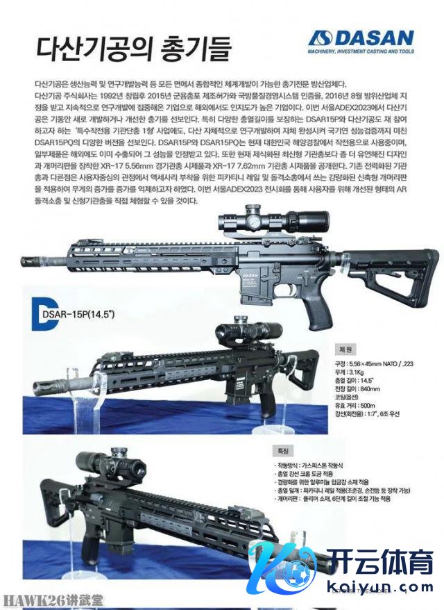 这些枪械皆是大山机械公司(Dasan Machineries)的居品,而该公司是韩国主要枪械制造企业。从这些枪械的策划不错看出,韩国枪械的策划受到好意思国的强大影响,步枪一起是 AR 系列,手枪则是 1911。